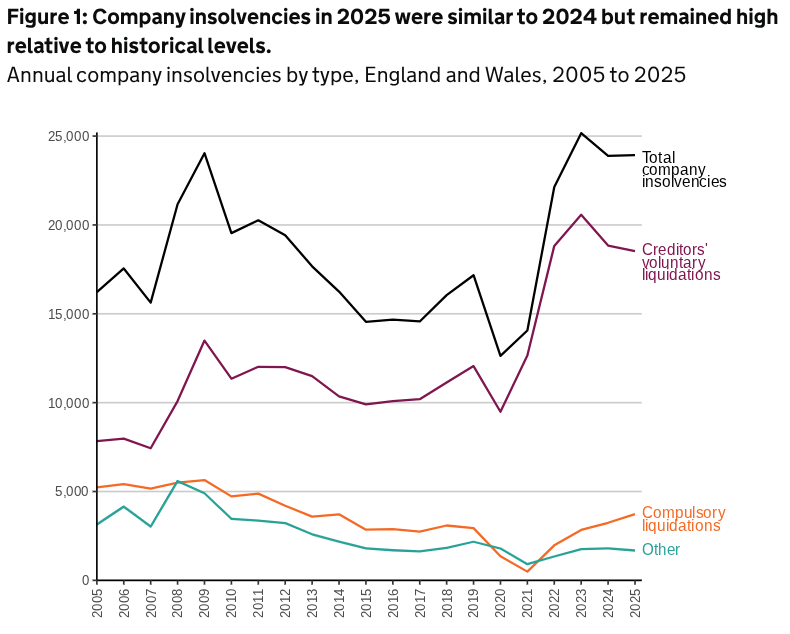 Tom Russell, R3 President, said: “Corporate insolvencies in 2025 remain at historically high levels with nearly 24,000 businesses becoming insolvent. Difficult trading conditions, high overheads and the impact of the national insurance rise weighed heavily on businesses last year.