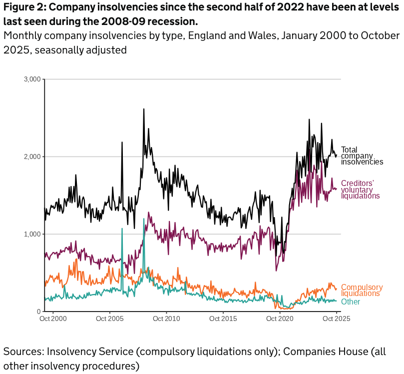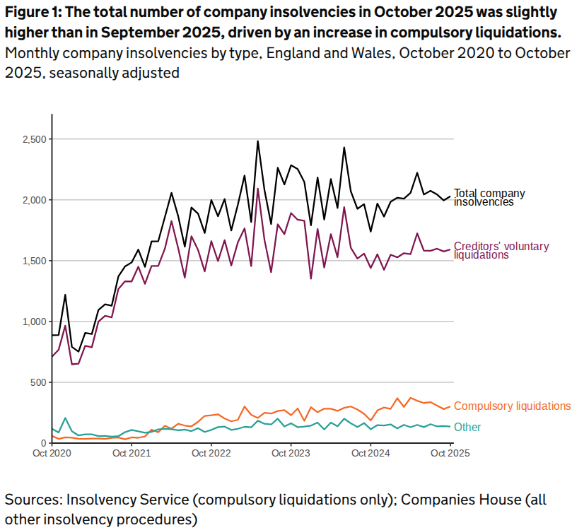 The total number of company insolvencies for the whole of the UK in October 2025 was 2,192 – a month-on-month increase of 61.