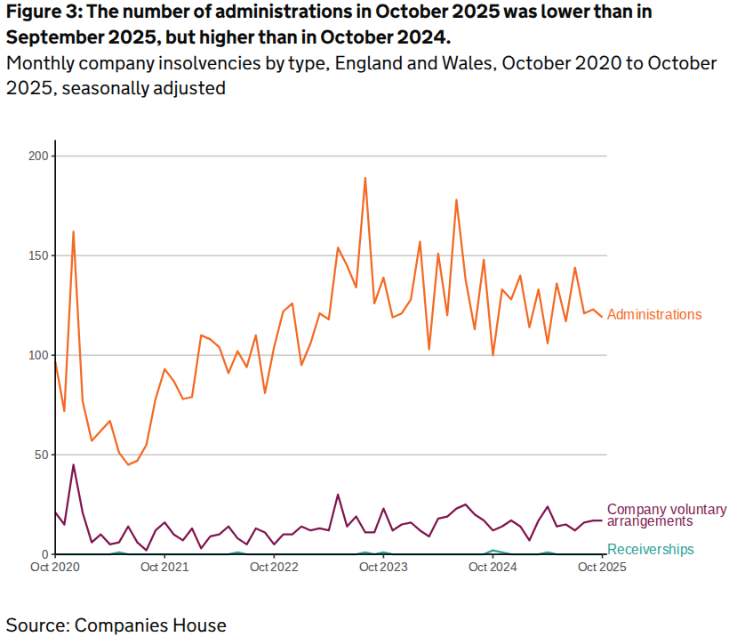 The number of CVAs in October 2025 was the same as in September 2025 and 42% higher than in October 2024. Numbers remain low compared to historical levels. CVAs are not seasonally adjusted due to low volumes.