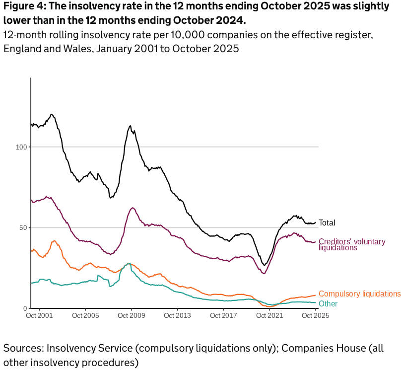 The rolling company liquidation rate in the 12 months to October 2025 was 53.4 per 10,000 companies which is equivalent to one in 187 companies entering insolvency. This is a slight increase from last month (52.9 or one in 189).