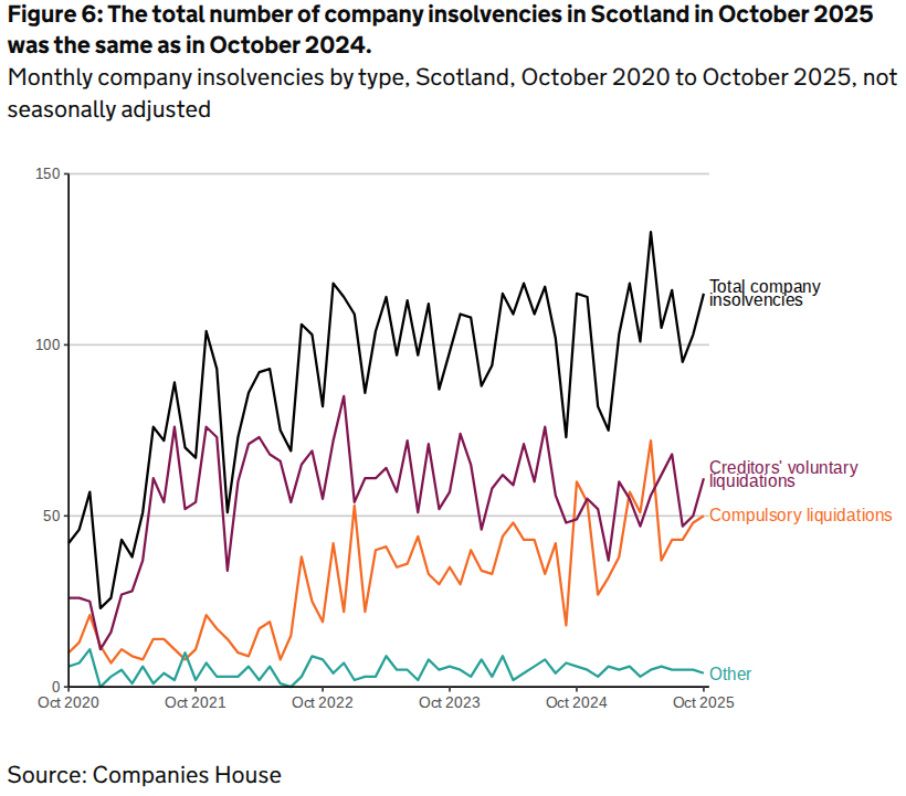 In Scotland last month there were 115 company insolvencies, which was 12 more than last month. It was exactly the same total from October 2024.
