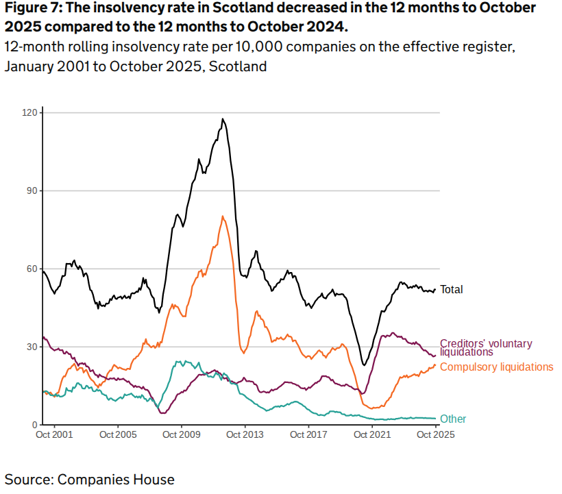 The total insolvency rate in Scotland in the 12 months up to the end of October 2025 was 52 per 10,000 companies on the effective register. This was slightly down (0.2%) from the preceding 12 months ending in October 2024.