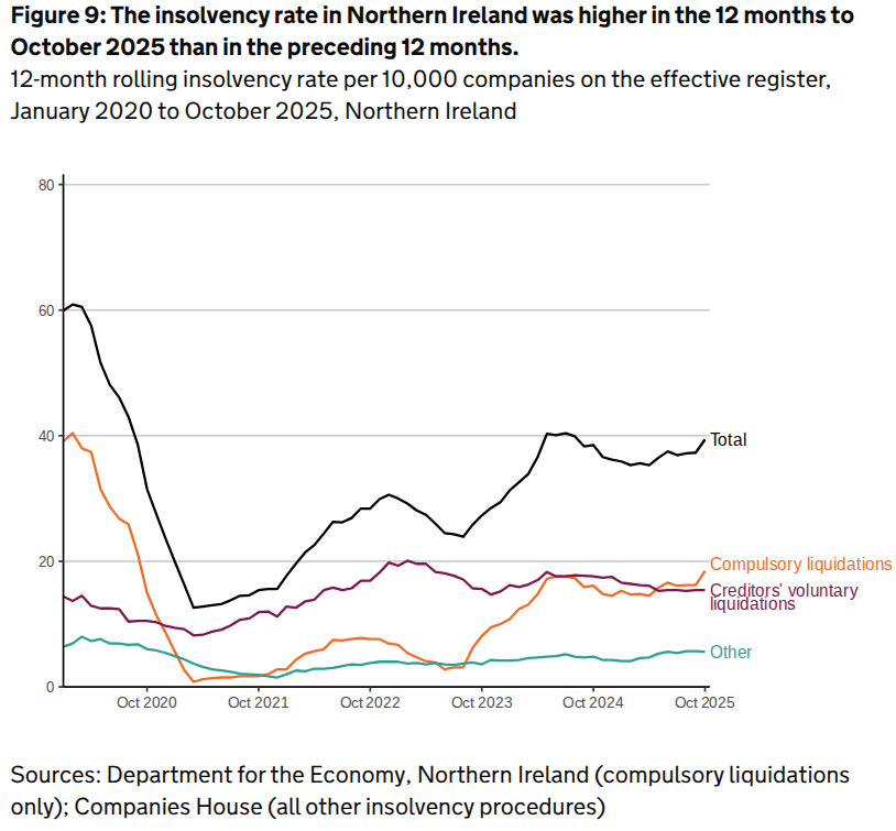 The total insolvency rate in the 12 months to October 2025 in Northern Ireland was 39.4 per 10,000 companies on the effective register. This was an increase of 2.1 from September’s total.