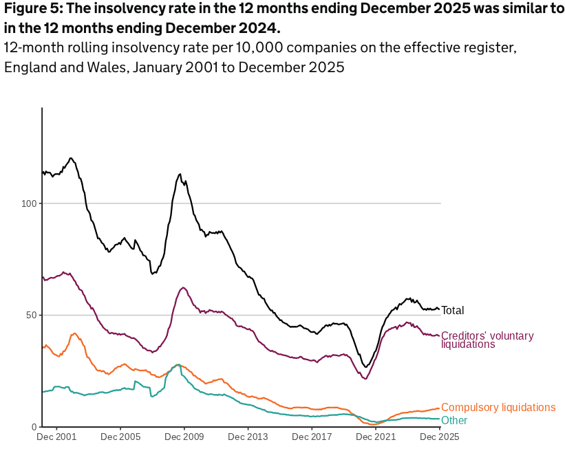 The rolling company liquidation rate in the 12 months to December 2025 was 52.5 per 10,000 companies on the effective register in England and Wales which corresponds to one in 190 entering insolvency. This is a slight decrease from last month (52.9 per 10,000 companies or one in 189 companies.)