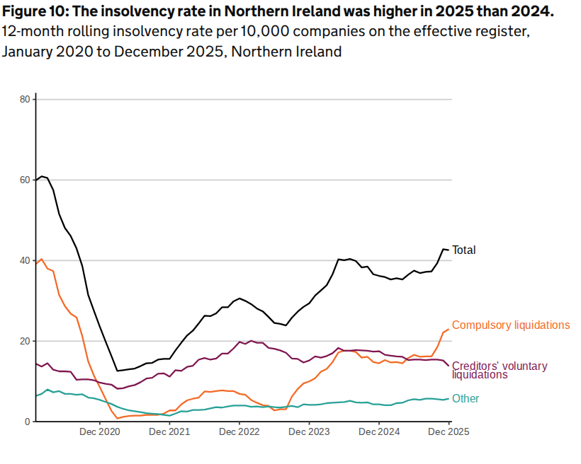 The total insolvency rate in 2025 in Northern Ireland was 42.6 per 10,000 companies on the effective register which was an increase of 6.4 from 2024.