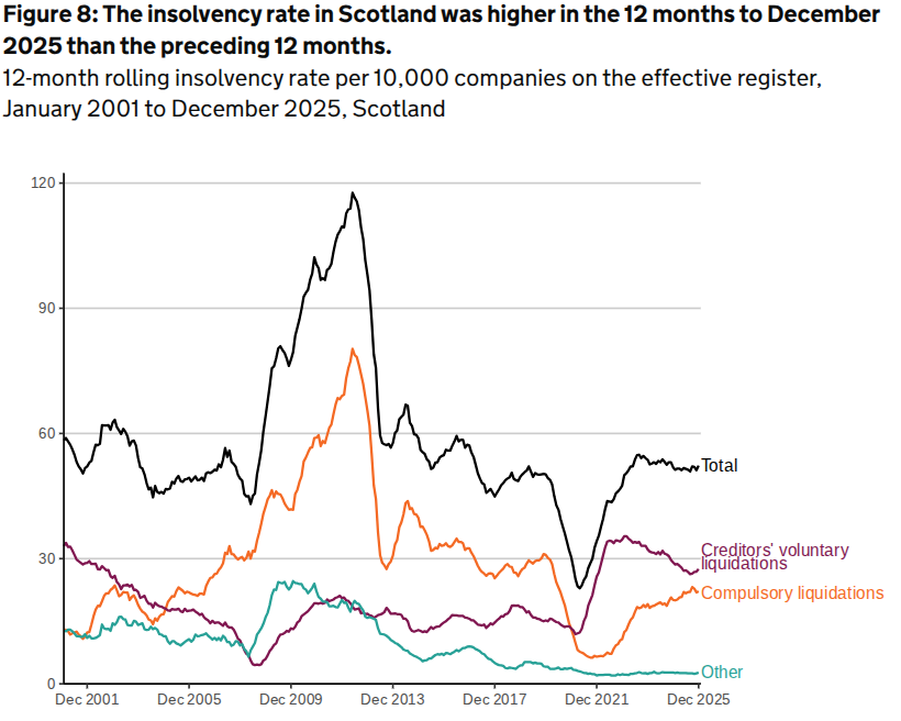 The total insolvency rate in Scotland in 2025 was 52.3 per 10,000 companies on the effective register which was up 0.4 from 2024.