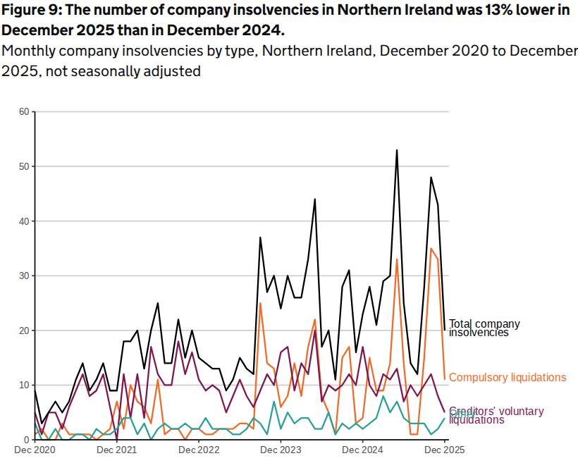 In December there were 20 company insolvencies registered in Northern Ireland, which was 13% lower than in December 2024.