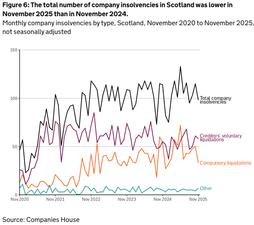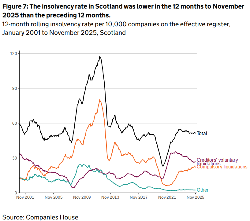 The total insolvency rate in Scotland in the 12 months to November 2025 was 51.2 per 10,000 companies on the effective register. This was down by 1.9 from the preceding 12 months ending November 2024.