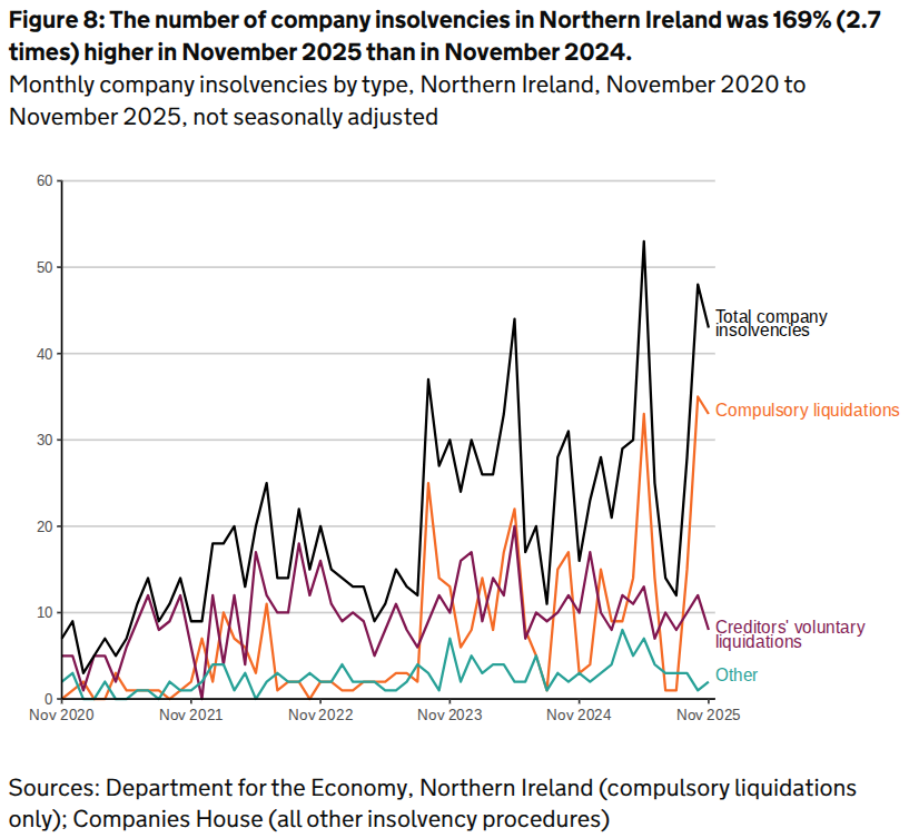 In November there were 43 company insolvencies registered in Northern Ireland which while five fewer than last month is 169% (2.7 times) higher than the same month a year ago.