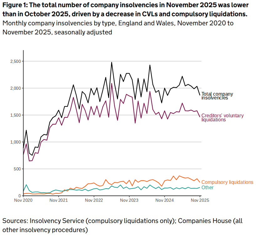 Of the 1,866 corporate insolvencies recorded in November, the most frequent type remains Creditors’ Voluntary Liquidations (CVLs) with 1,461.