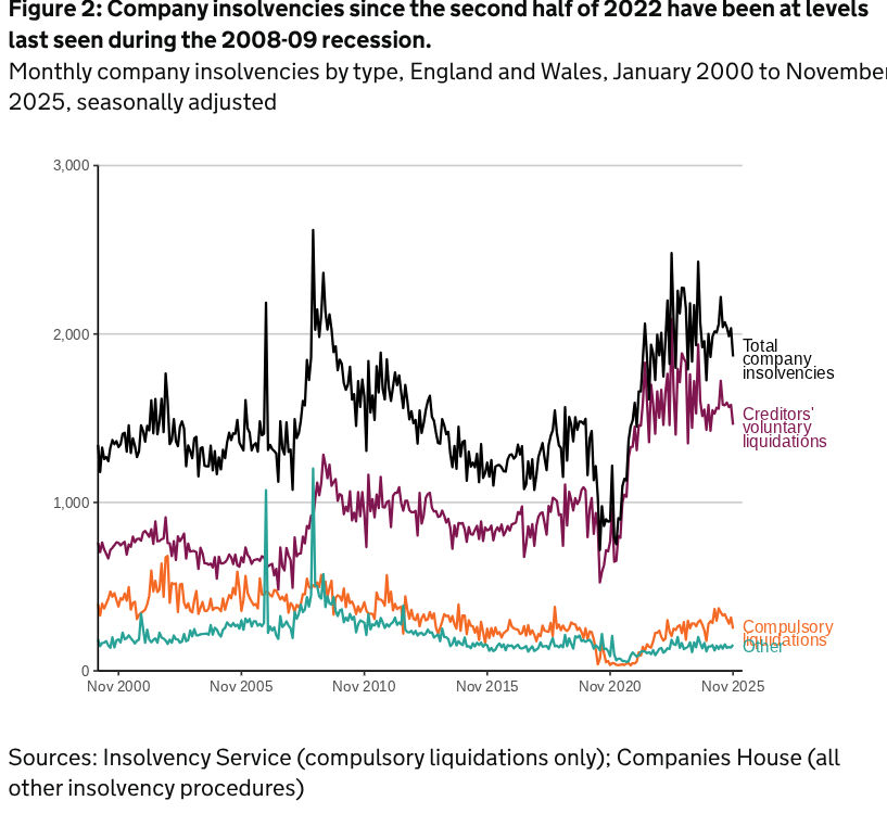 The total number of company insolvencies for the whole of the UK in November 2025 was 2,007 – a month-on-month decrease of 185.