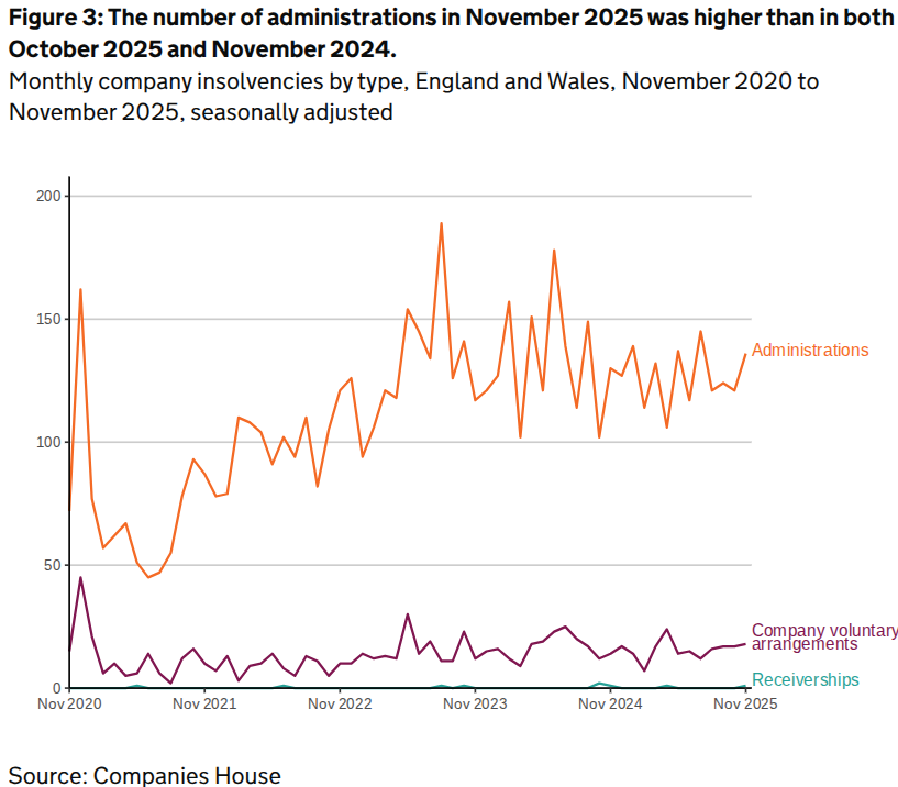 There were 18 Company Voluntary Arrangements (CVAs) in November which was one higher than last month (6% rise) and 29% higher than in November 2024. Numbers remain low by historical levels and the average monthly total is lower than in 2024 and similar to 2023.