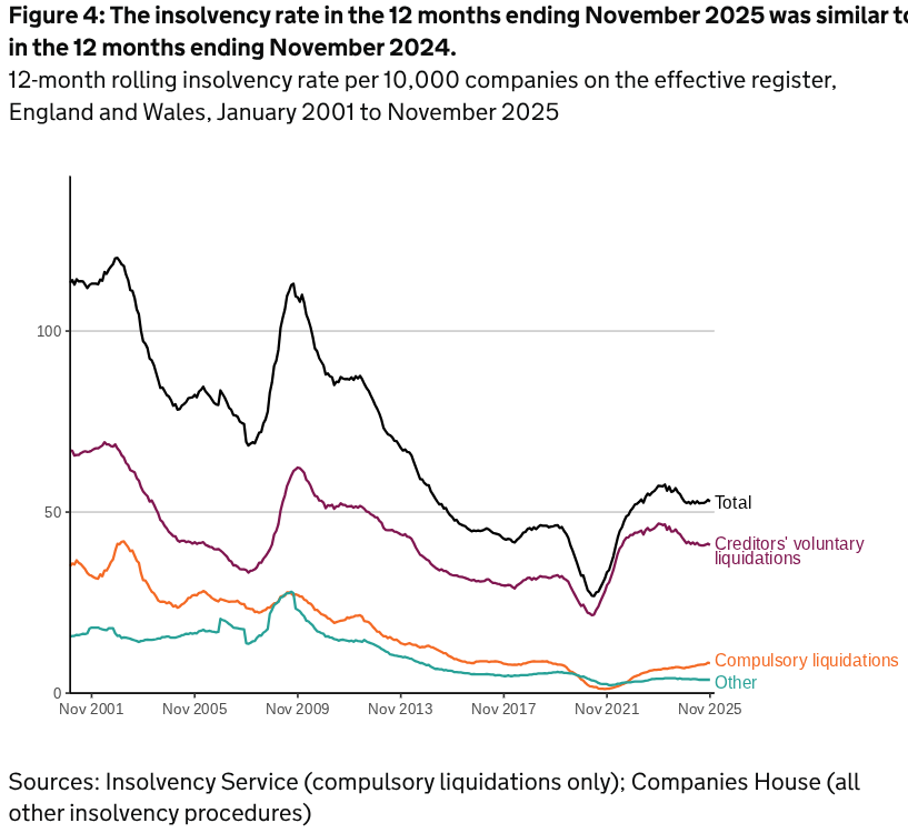 The rolling company liquidation rate in the 12 months to November 2025 was 52.9 per 10,000 companies on the effective register in England and Wales. This corresponds to one in 189 companies entering insolvency which is a slight decrease from last month (53.4 or one in 187).