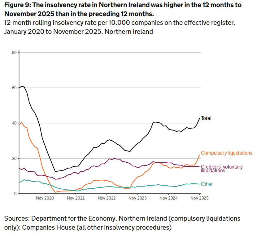 The total insolvency rate in the 12 months to November in Northern Ireland was 42.8 per 10,000 companies on the effective register. This is an increase of 6.2 from the 12 months to November 2024.