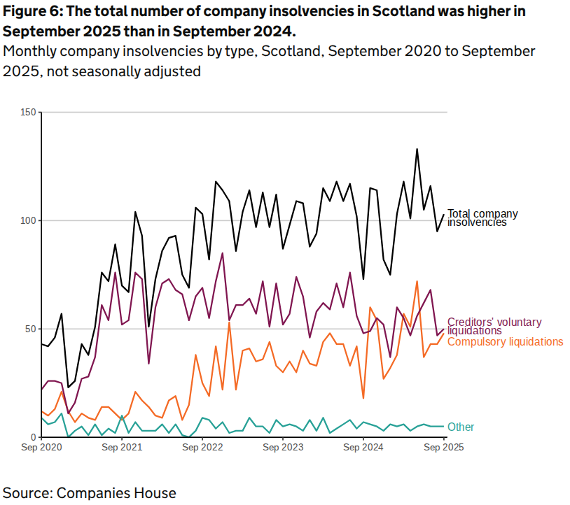 In Scotland last month there were 103 company insolvencies, which was eight more than last month. It is also 41% higher than the same month last year.