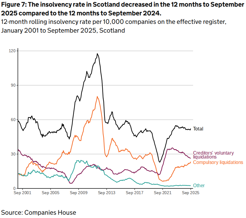 The total insolvency rate in Scotland in the 12 months to September 2025 was 52.2 per 10,000 companies on the effective register. This was up by 1.2 from the preceding 12 months ending September 2024.